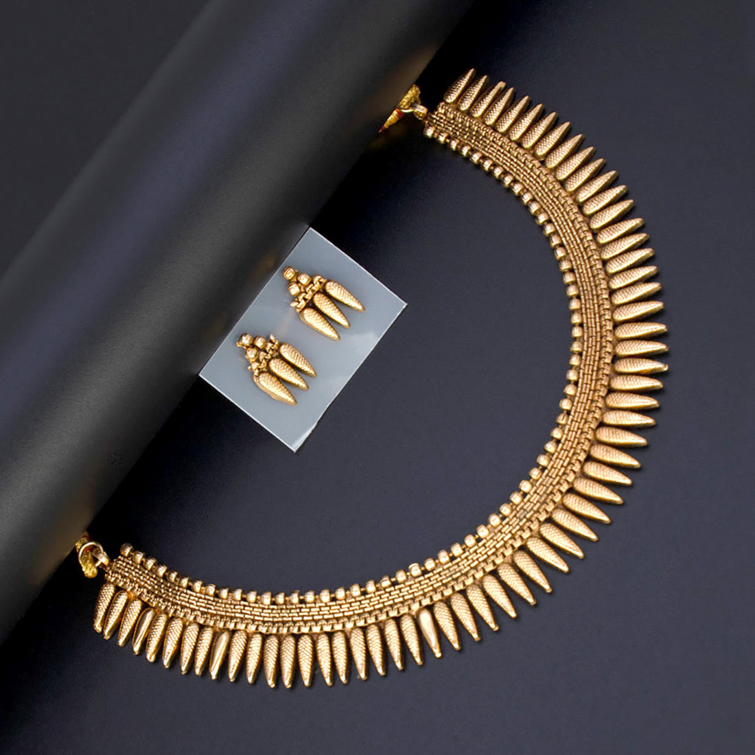 Antique Gold-Plated Jasmine Buds Necklace Set featuring intricately crafted with spike-shaped jasmine buds complemented by matching earrings. Perfect for weddings, festive celebrations, and ethnic wear.
