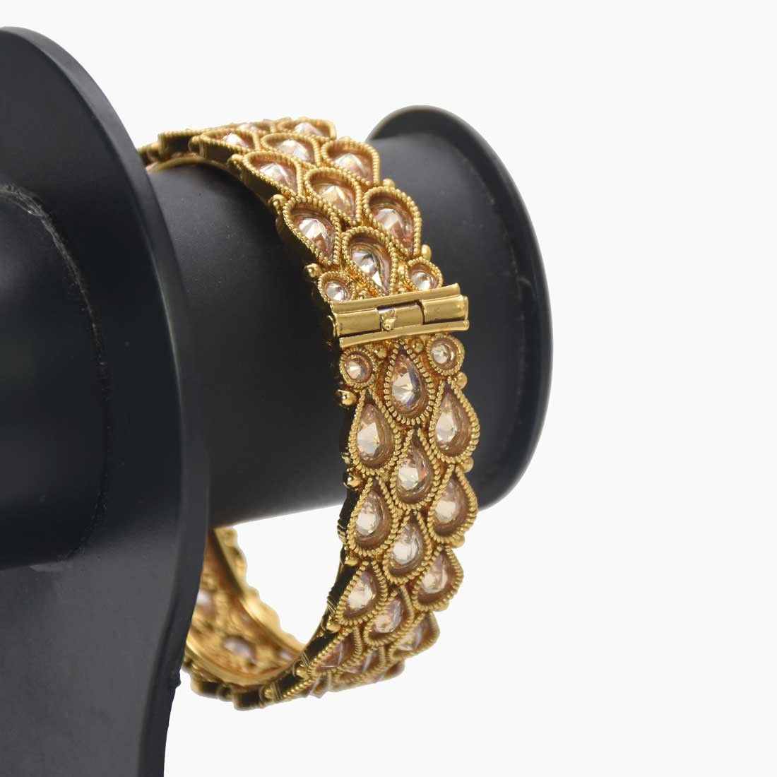 Tear Drop Antique Gold Plated Kundan Screw Bangle for Girls and Women. Kollam Supreme classic synthetic Kundan Stone Kada has a beautiful, awesome look. This Indian hand jewellery goes well with ethnic wear on festive occasions and Marriage functions.