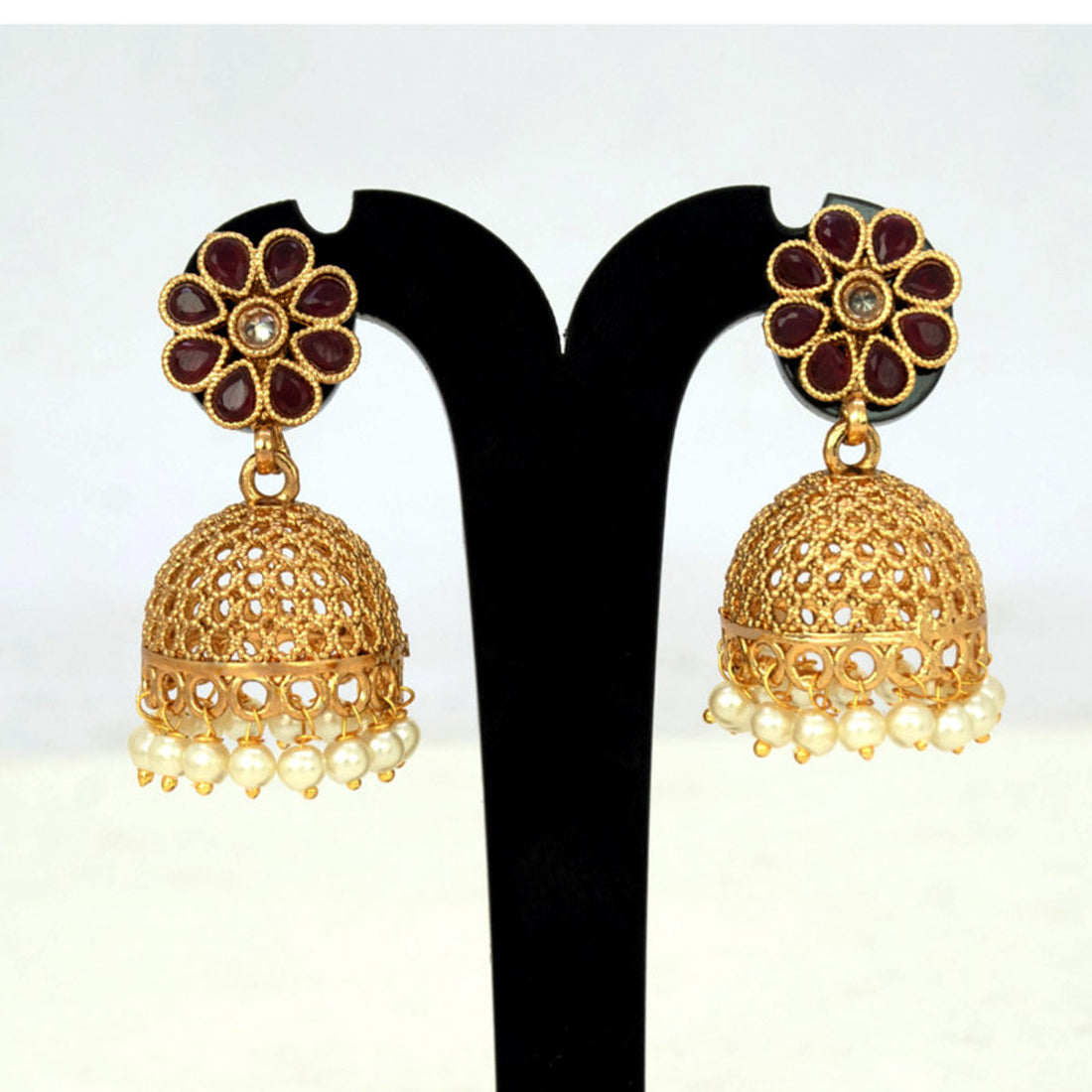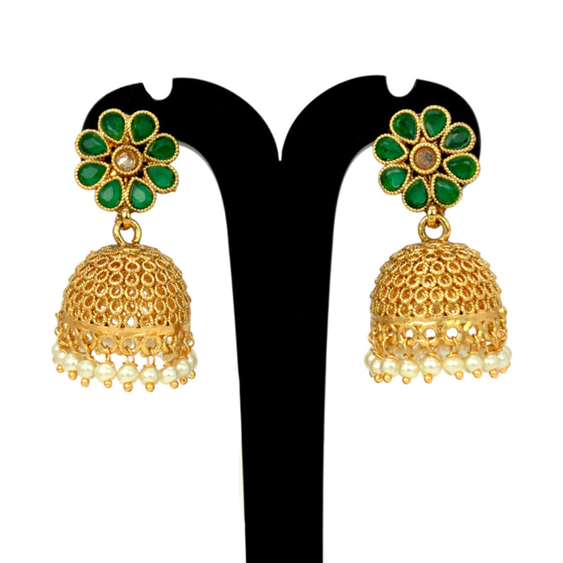 Antique Matte Floral Stone Jhumka with Pearl Danglerss a very trendy party wear Jewellery. These gorgeous jumkey earrings have an intricate design and ruby/emerald stone floral studs and white pearl hangings. It will give a classic and trendy look to your beauty on festive occasions and Marriages with any outfit.
