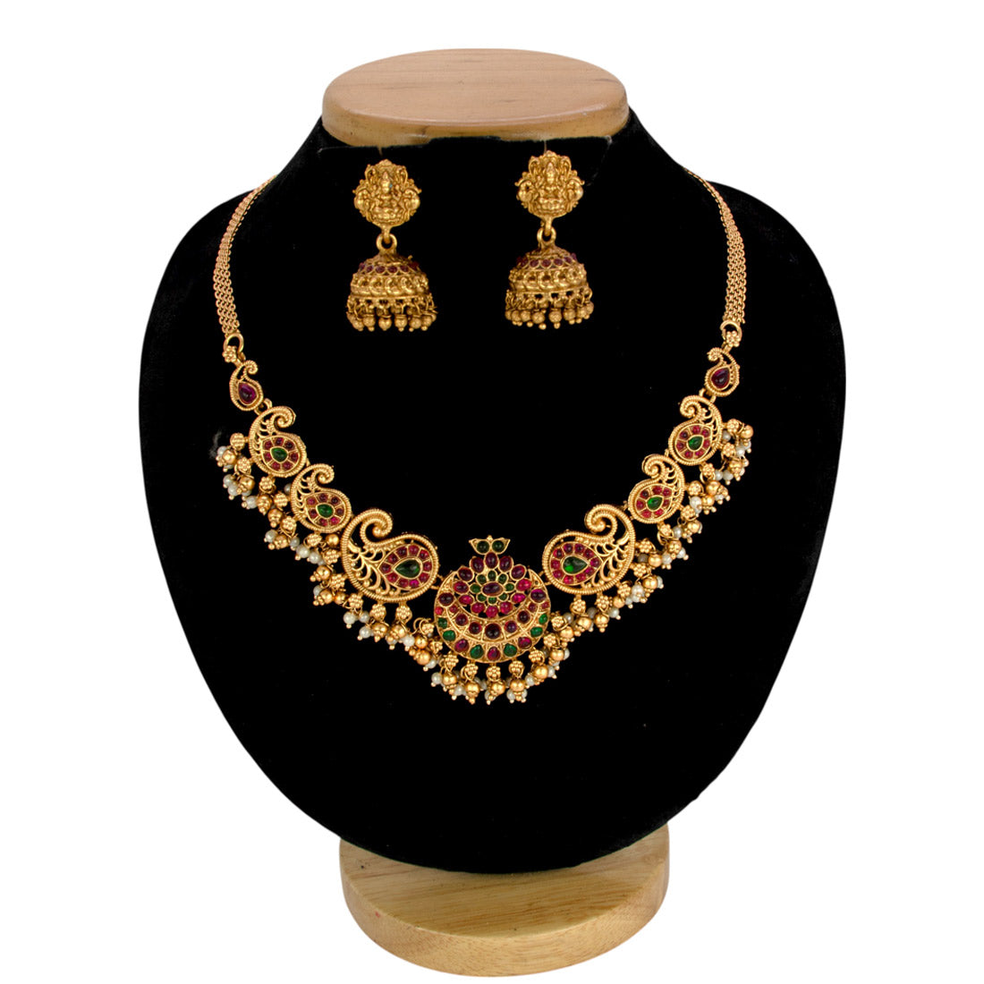 This stunning Big Paisley Antique Gold Plated Choker and Lakshmi Jhumkas. Crafted with traditional motifs and highlighted with smooth Kemp red and green stones, this piece exudes South Indian temple jewellery charm. The big floral central pendant and hanging pearls and golden beads add majestic elegance. Paired with classic Lakshmi jhumka earrings, this set is perfect for weddings, classical dance, or festive occasions.