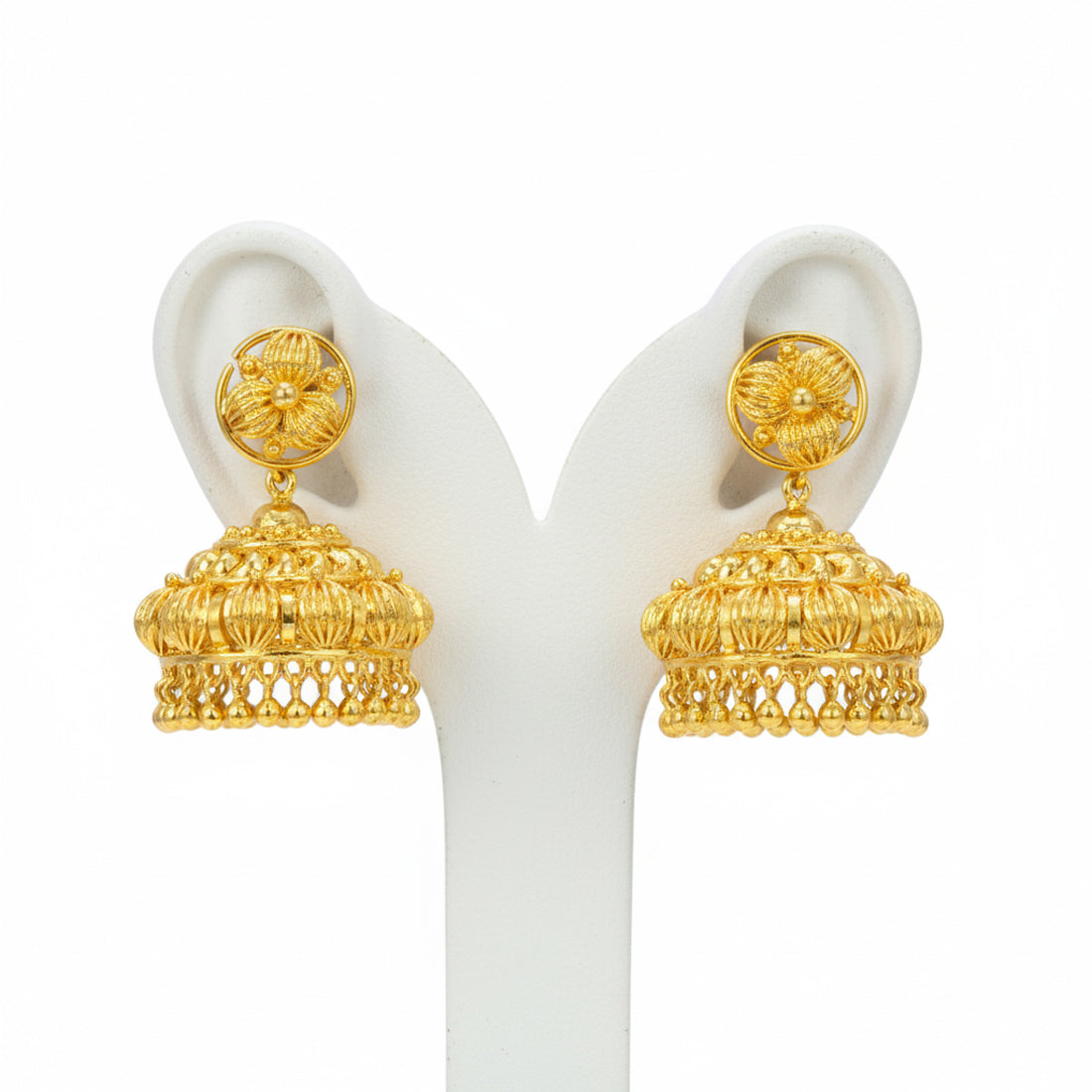 These gold-plated dome-shaped jhumka earrings feature intricate floral designs. Perfect for weddings, festive occasions, and traditional outfits. Lightweight and comfortable for all-day wear.