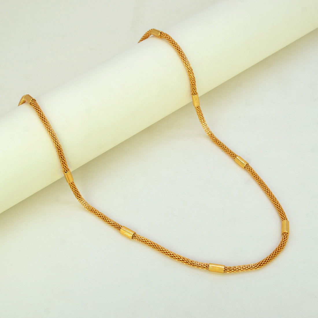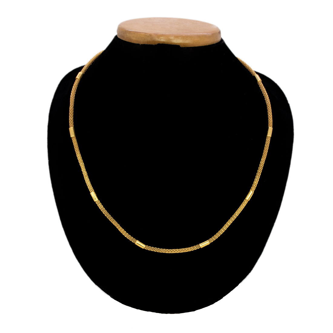 Elevate your style with this beautifully crafted Elegant Gold Plated Mesh Pipe Chain. Designed with a delicate mesh pattern and accented with smooth cylindrical details, this chain is a perfect blend of elegance and durability. Its lightweight design makes it comfortable for daily wear, while the lustrous gold plating adds a touch of sophistication, making it equally suitable for festive and special occasions. Wear it solo for a classic look or pair it with your favourite pendant for added charm.