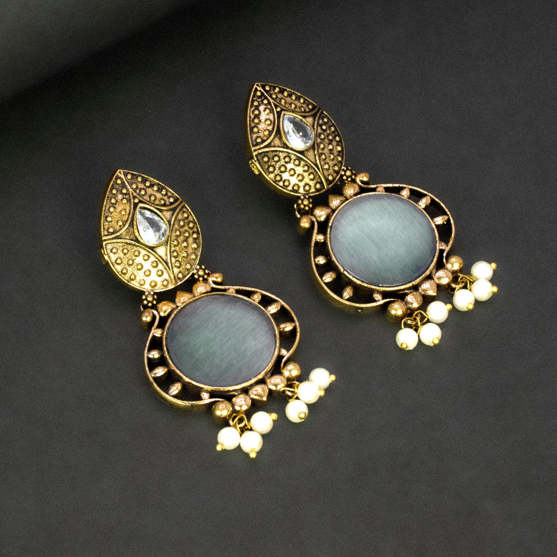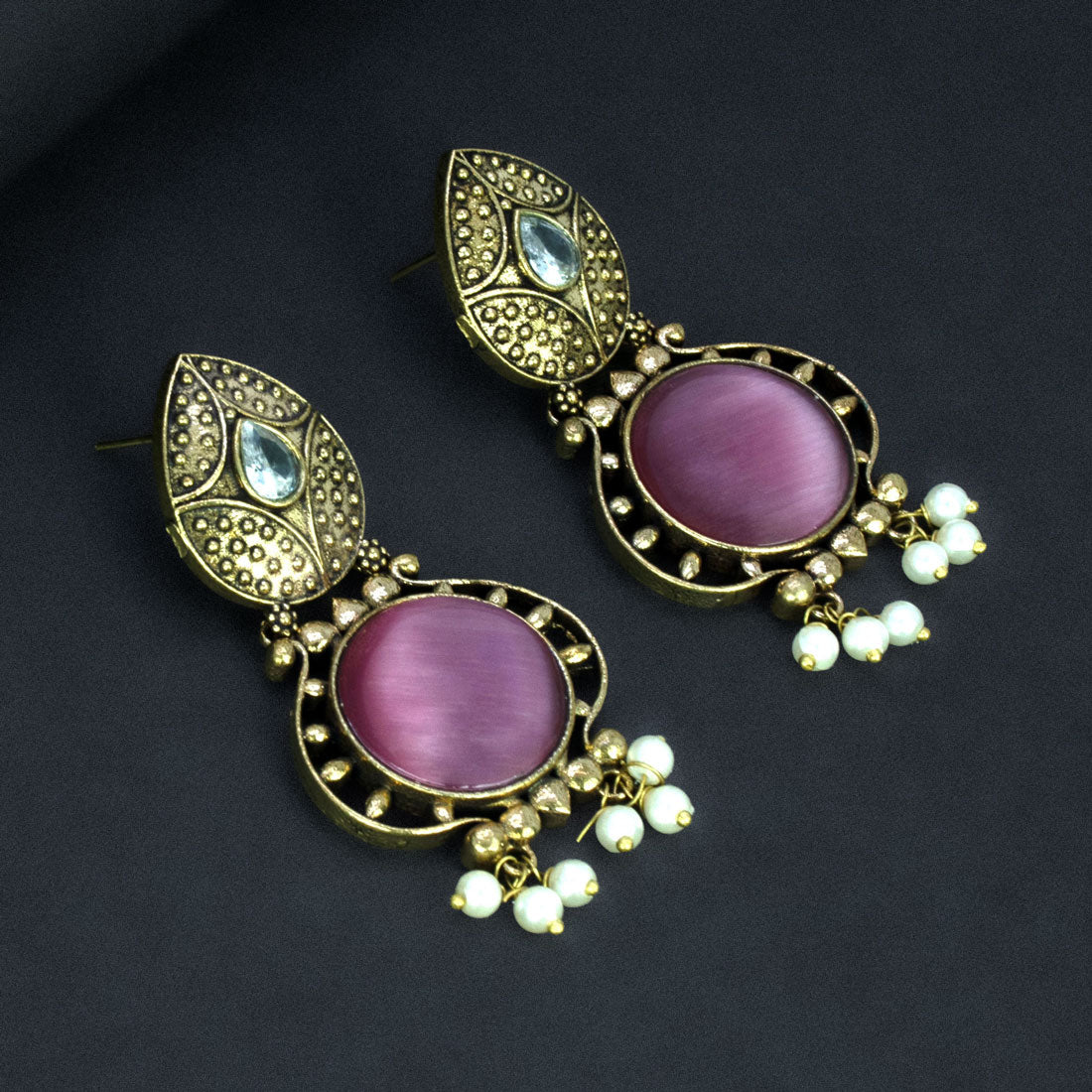 Enhance your ethnic charm with these Fashion Golden Oxidized Monalisa Stone Earrings. The drop earrings feature a white stone on the top stud, followed by a bold round Monalisa stone centrepiece in multi color variants. Finished with delicate pearl drops that add graceful movement and charm, they combine traditional elegance with modern style, making them perfect for weddings, parties, and festive occasions.