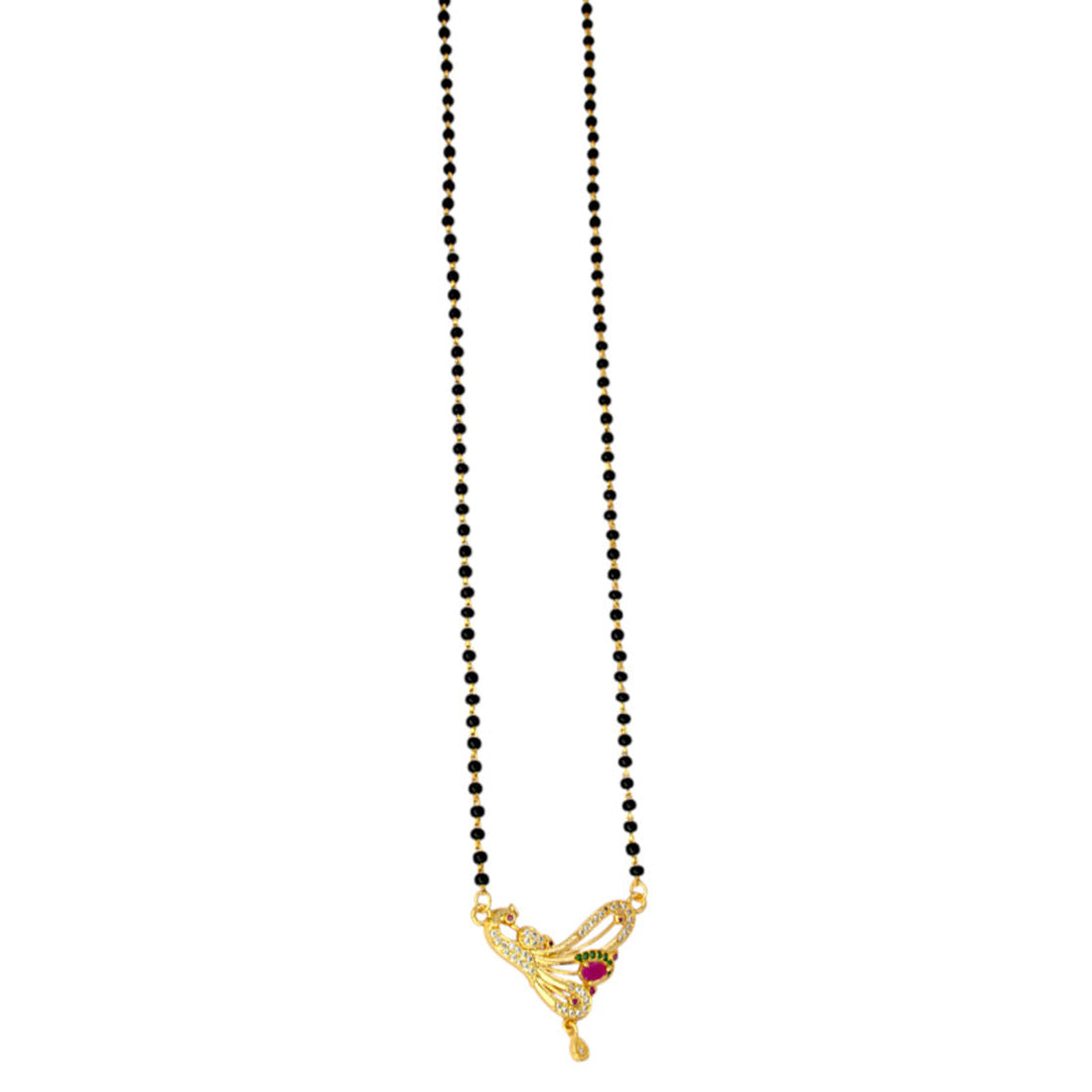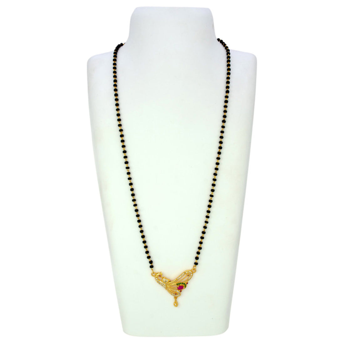 A stylish Gold Plated Peacock Pendant Mangalsutra Chain featuring a beautifully designed peacock pendant, embellished with sparkling CZ and ruby emerald stones, paired with a traditional black bead chain.