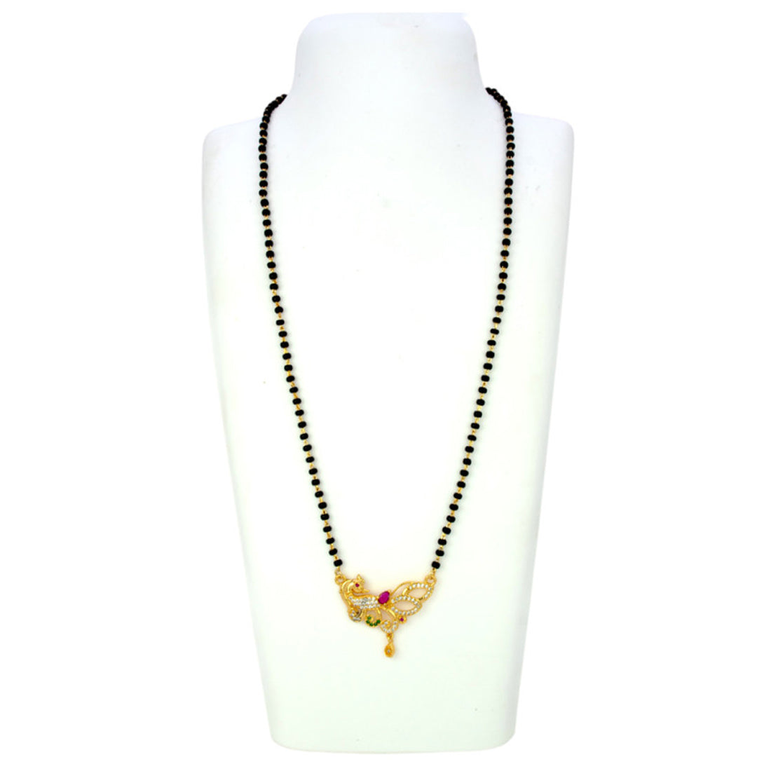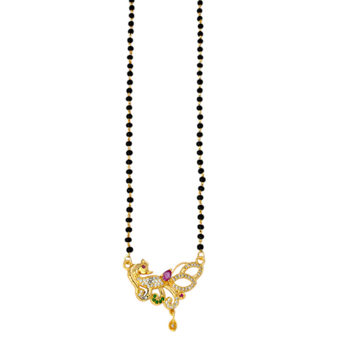 A stunning Gold Plated Peacock Stone Pendant Mangalsutra Chain featuring a designer peacock pendant adorned with sparkling Ruby, Emerald and CZ stones for a timeless traditional look.. Both Traditional and stylish, this is the perfect accessory to wear on a daily wear!!