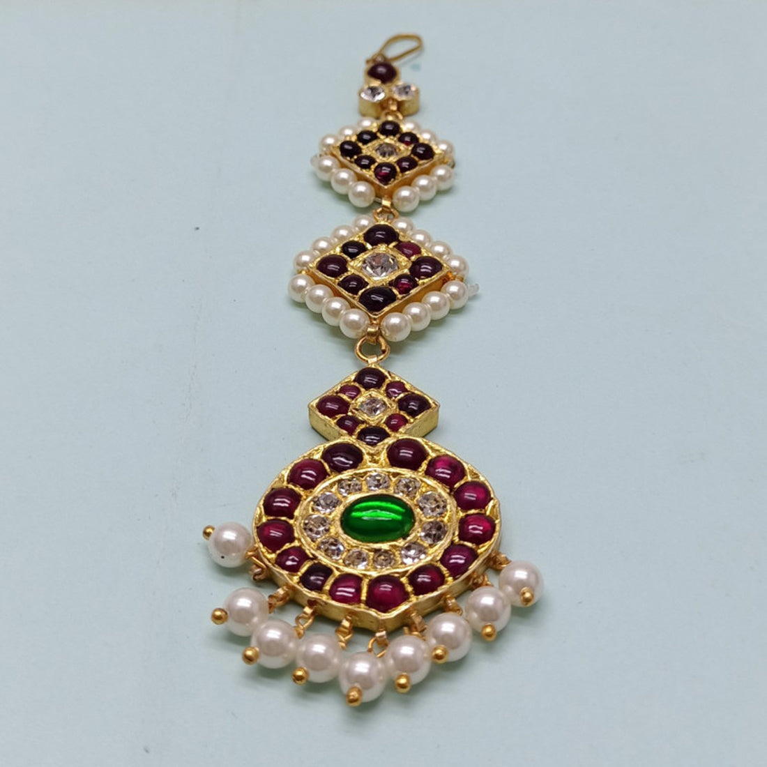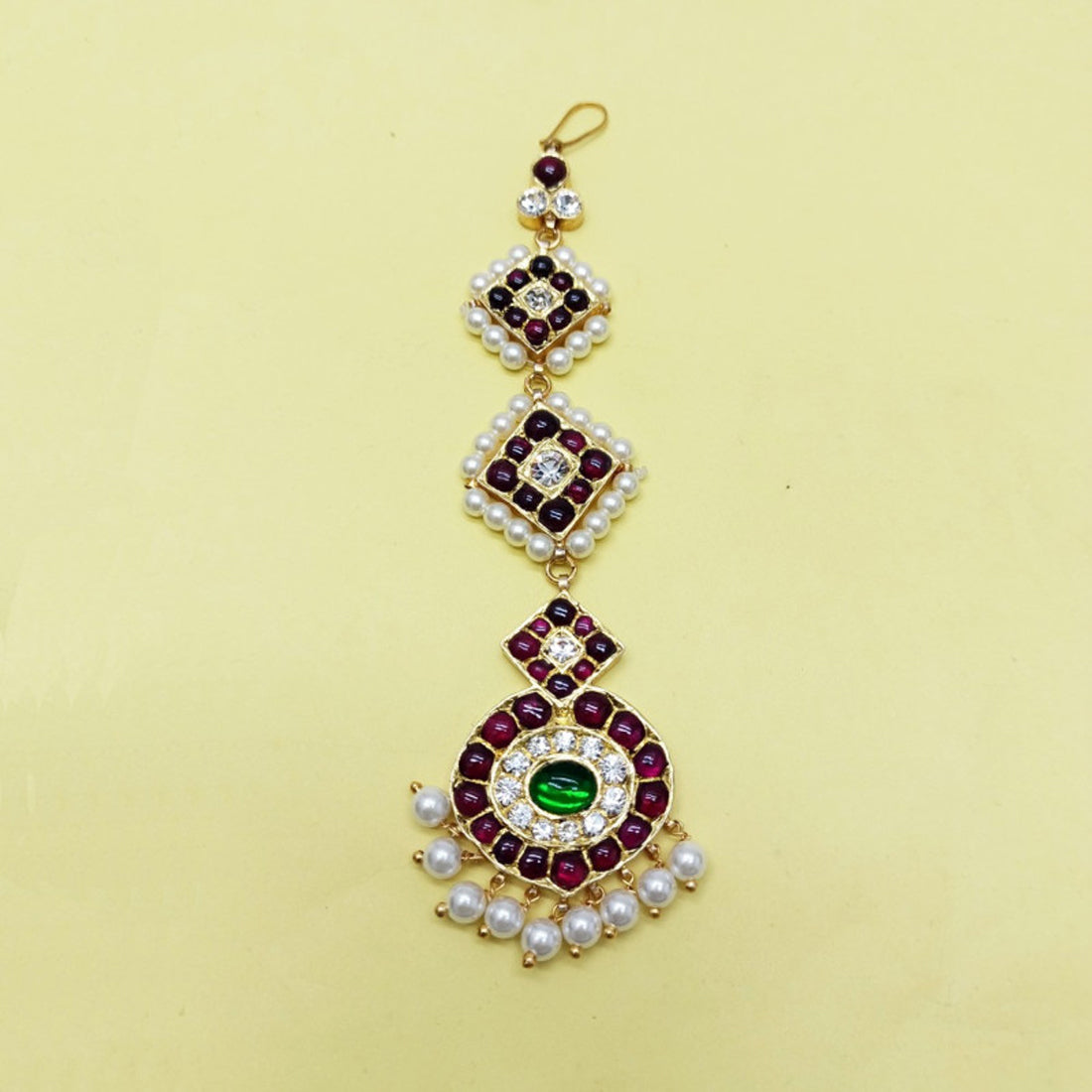 Real Kemp Stone RGW Step Maang Tikka Nethichutti is an original temple jewellery headset for dancers. This tikka is used instead of the full headset for small children and dancers. This is made of silver and finished with gold leaf work. It is studded with original Kemp stones, CZs, and pearls. This can be worn for Indian classical dances like Mohiniyattam, Bharatanatyam, and Kuchipudi.