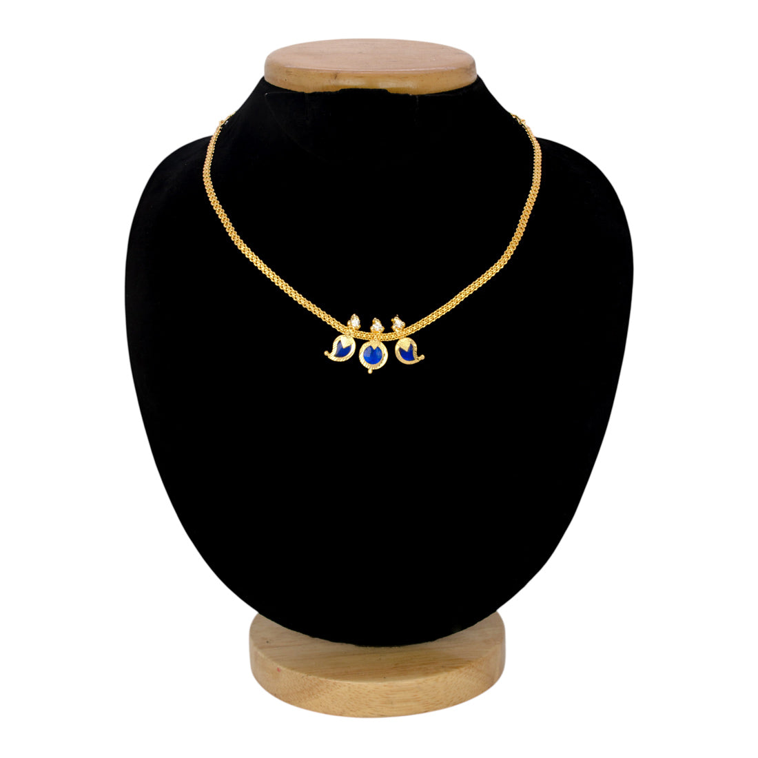 Simple Three Petal Gold Plated Mango Necklace adorned with CZ stones in blue mango and a round pendant. A perfect blend of elegance and culture. Pair this choker necklace with Sarees or ethnic wear for a classic look.
