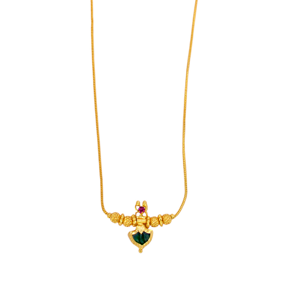 Simple Traditional Gold Plated Small Palakka Pendant Chain available in stunning Blue and Green variants. These traditional Kerala-style necklaces feature a Palakka pendant adorned with CZ/Ruby stones in a thin chain having golden designer beads. Perfect for daily wear, festive occasions, and gifting, these pieces beautifully blend tradition with subtle sophistication. Choose your favorite color to complement your ethnic attire.