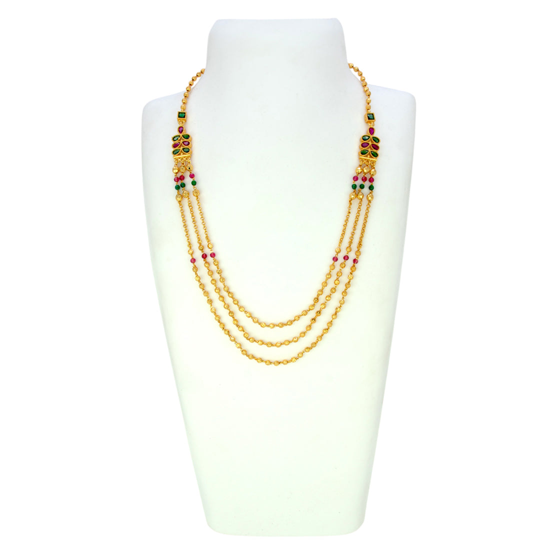 Elevate your ethnic charm with this Stylish Gold Plated Designer Beads Layered Necklace. Featuring three elegant layers of finely crafted chains adorned with red and green beads and ruby emerald stones, this necklace brings together tradition and modern elegance. The gold-plated finish adds richness, while the vibrant synthetic stones enhance its festive appeal. Ideal for weddings, cultural occasions, and parties, this piece is a must-have in every jewelry collection.