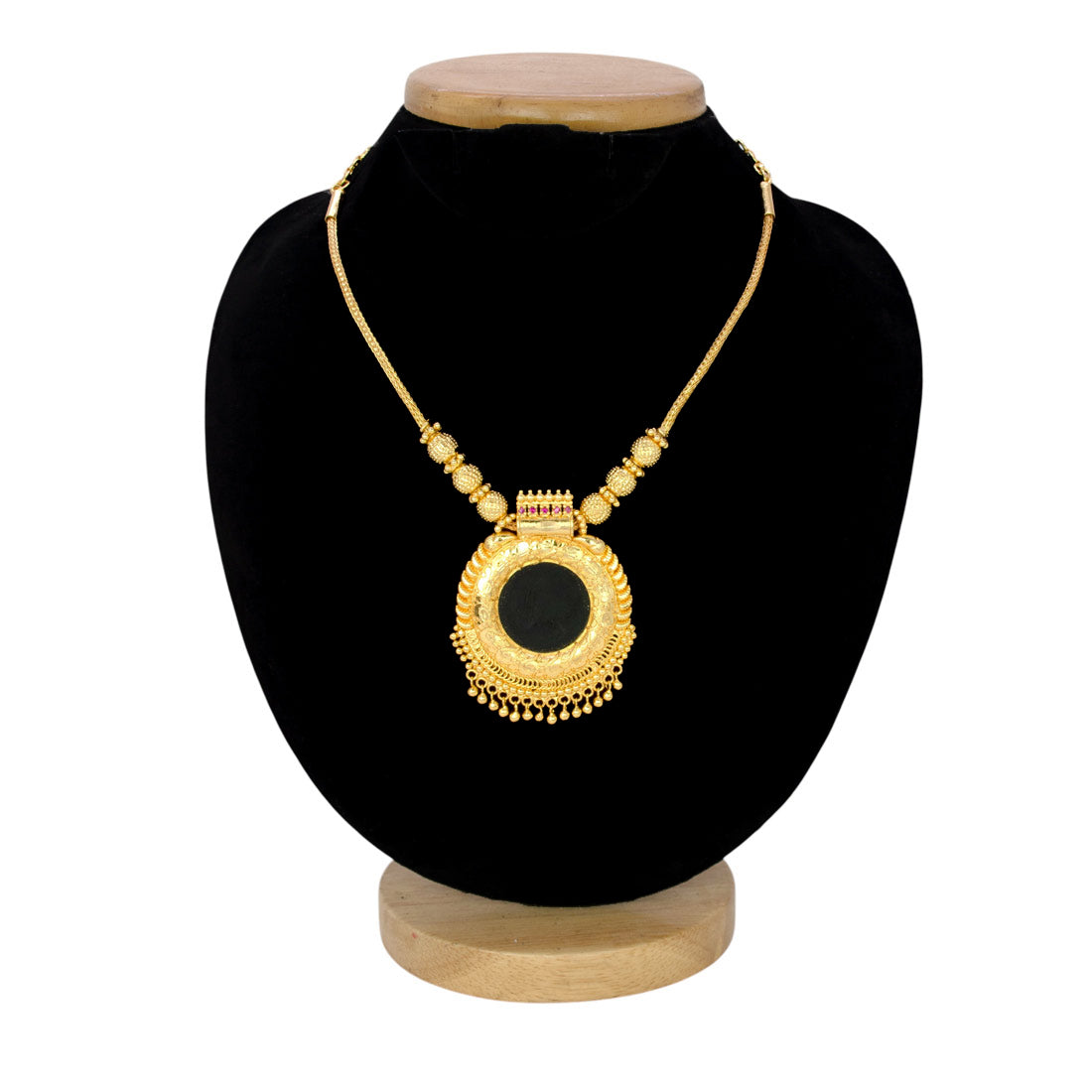 Traditional Gold Plated Big Enamel Pendant Necklace for women. Kerala traditional designer pendant with a smooth chain having stripe-designed beads. This gorgeous chain with a pendant will definitely be a treasured inclusion in every woman's jewellery collection. Team this imitation jewellery with any ethnic wear for parties, Weddings or Engagement functions.
