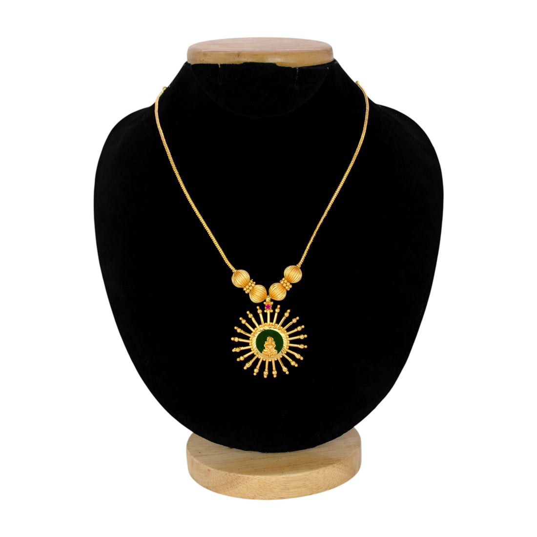 The focal point is the auspicious pendant, crafted in a striking Sunburst design. At its heart, the central deep green base, inspired by the Palakka, provides the backdrop for a beautifully detailed Engraved Motif of Goddess Lakshmi. The piece is finished with a small Ruby stone above the pendant, completing the traditional color palette.
