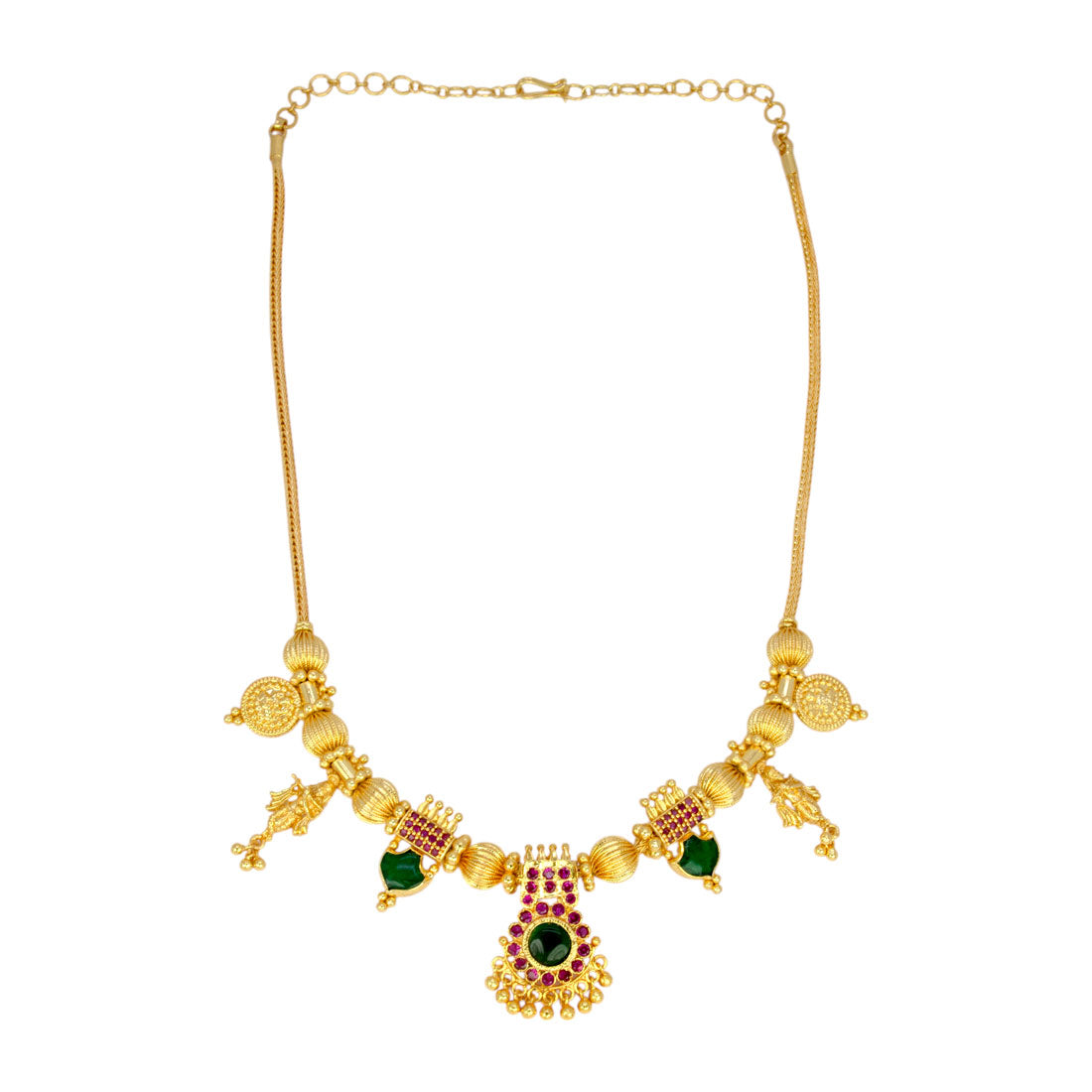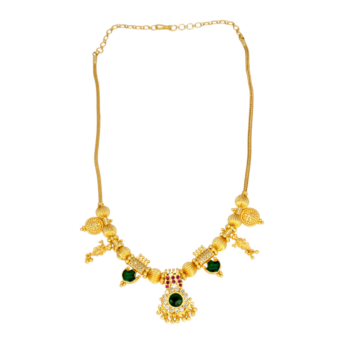 Elevate your ethnic ensemble with this exquisite Traditional Gold Plated Sree Krishna Palakka Pendant Necklace inspired by timeless South Indian temple jewelry. This masterpiece features Krishna motifs with green palakka, symbolizing prosperity and grace, elegantly suspended along a delicate gold-plated chain. Each Krishna pendant is adorned with fine detailing, creating a regal and divine aura.
