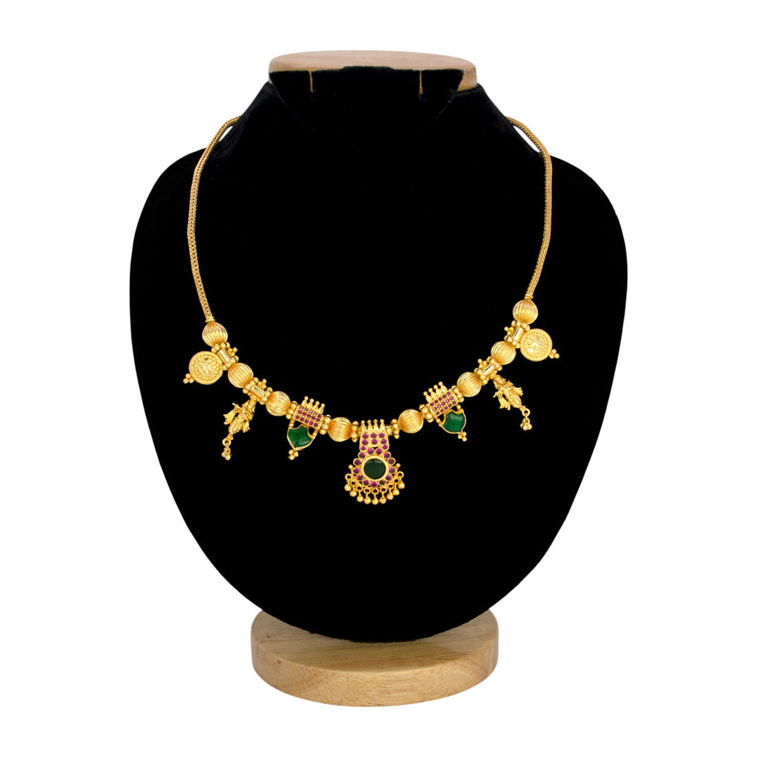 Elevate your traditional look with this stunning Traditional Gold Plated Sree Krishna Palakka Pendant Necklace, inspired by classic South Indian temple jewelry. Green Palakka adorned with Ruby/CZ stones, Krishna motifs and statement round pendant, this necklace is a perfect blend of heritage and elegance, ideal for festive occasions, weddings, and celebrations.