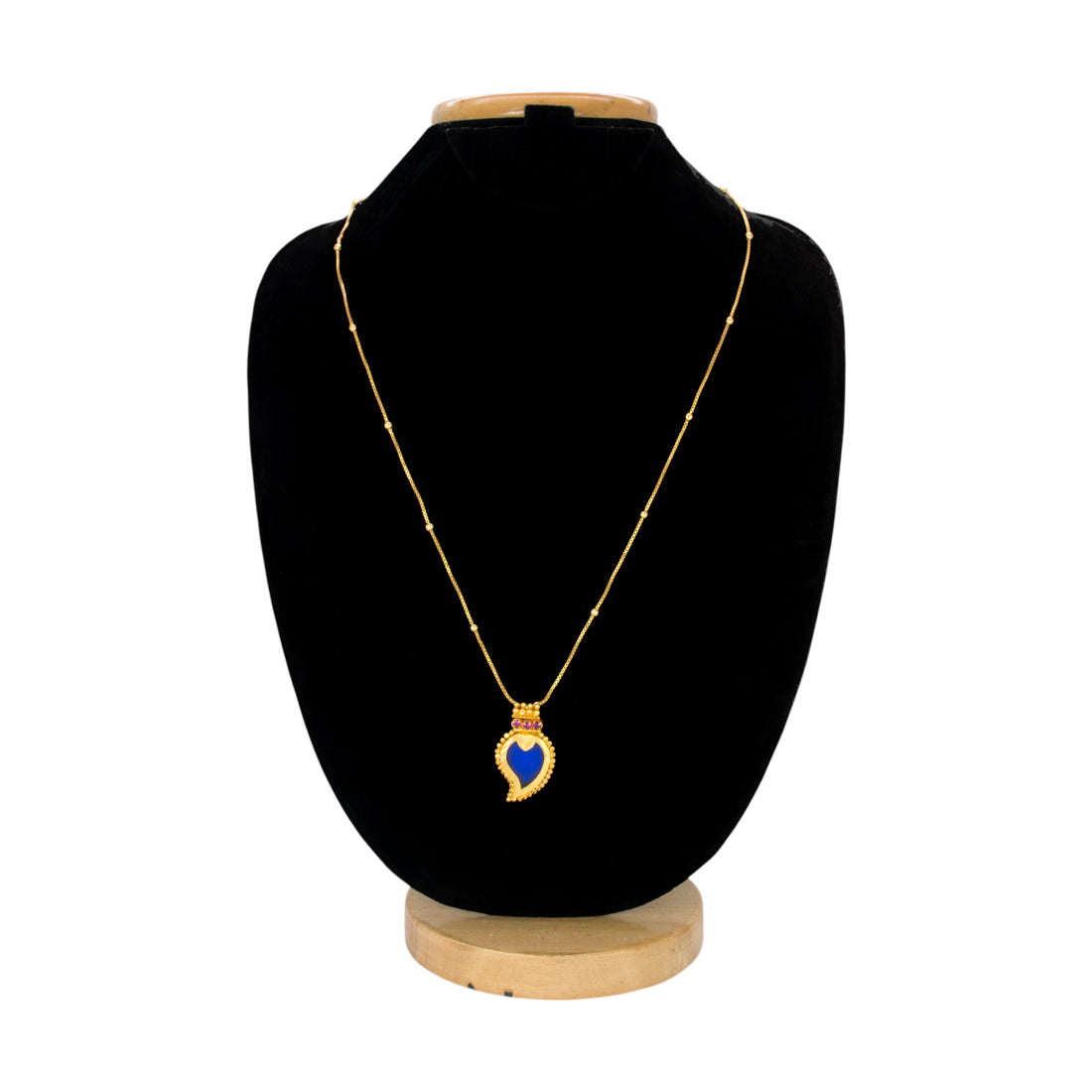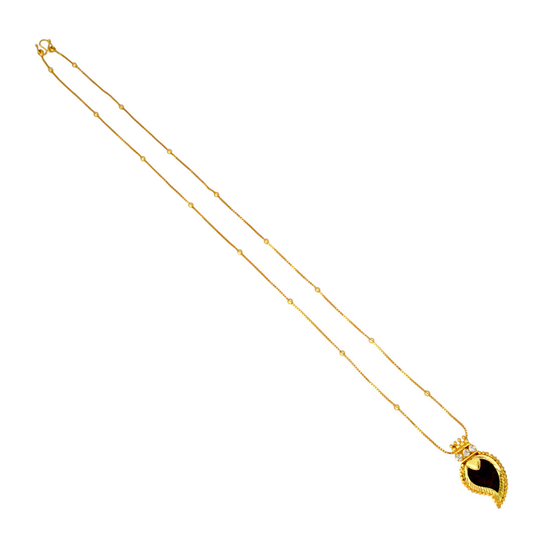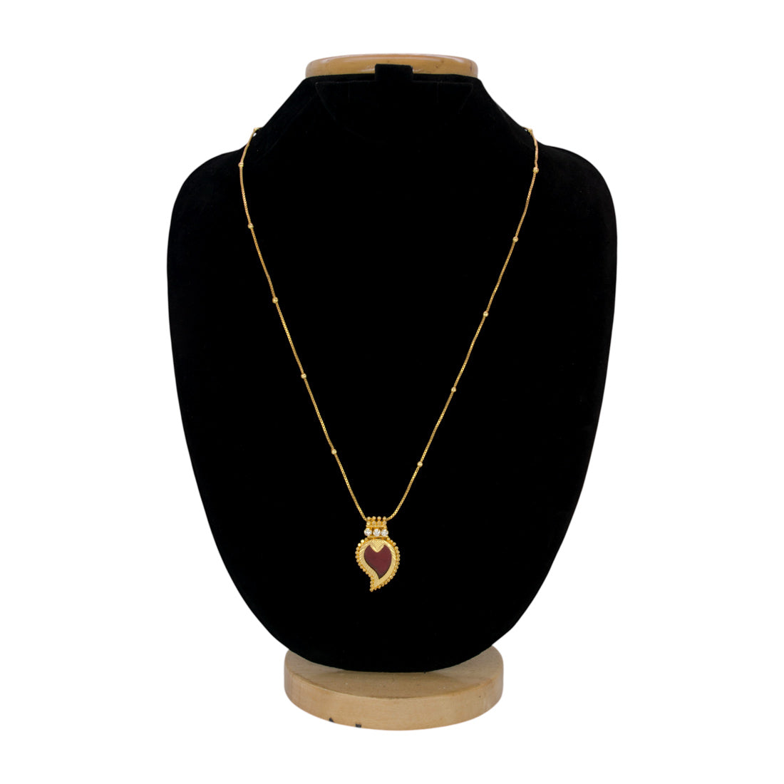 Traditional Small Gold Plated Mango Pendant Chain for Girls. Kerala traditional gold-plated pendant adorned with synthetic Ruby/CZ stones in a thin box chain with golden designer beads. This imitation pendant and chain will definitely be a treasured inclusion in every woman's jewellery collection. Team this elegant Pendant Chain with any ethnic wear for parties, Weddings or Engagement functions.