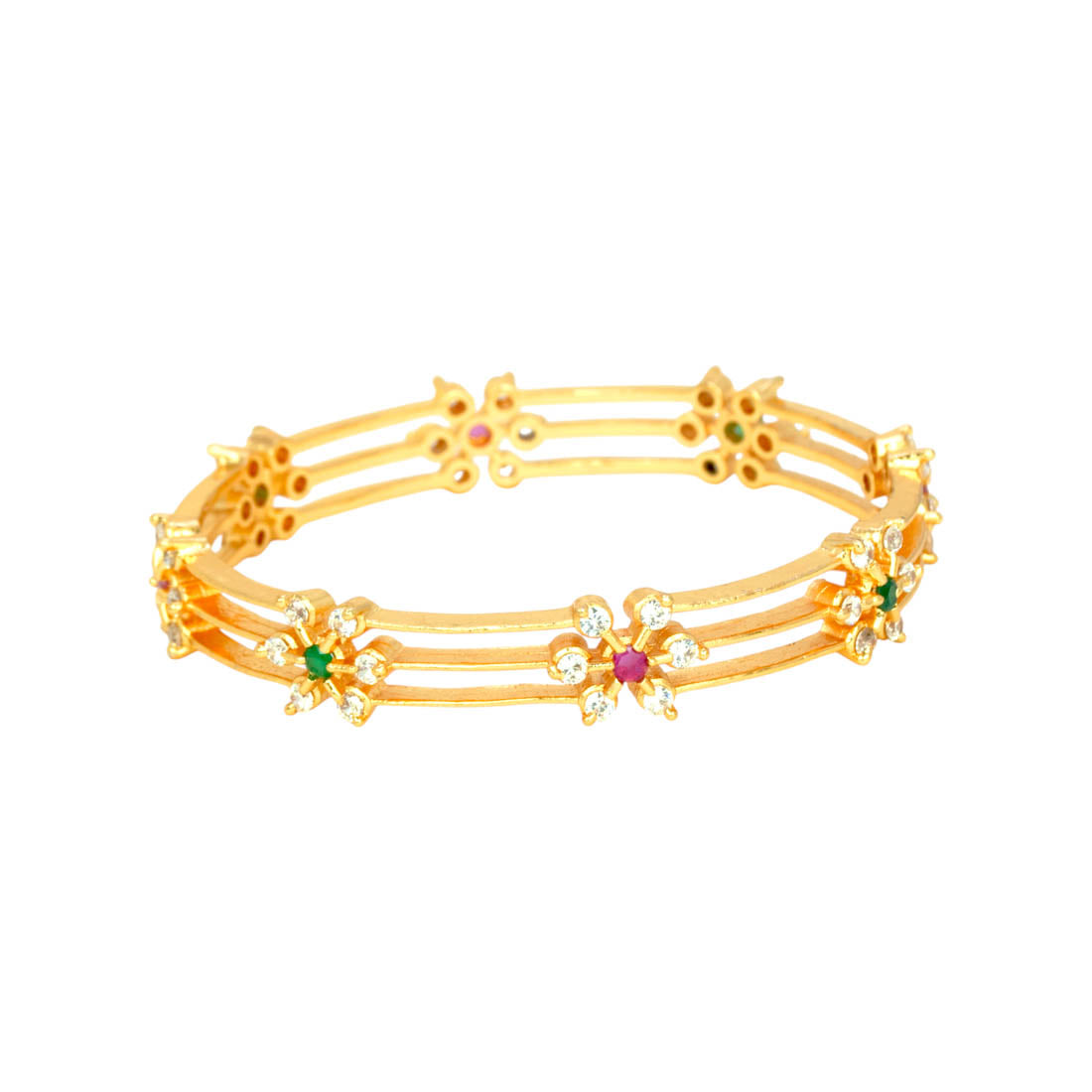 Add a touch of sparkle and sophistication to your look with this Trendy Gold Plated Floral Stones Thin Layer Bangle. Beautifully crafted with a delicate flower design, this bangle features a stunning combination of synthetic ruby, emerald, and CZ stones, giving it aStyleClub graceful and fashionable appeal.