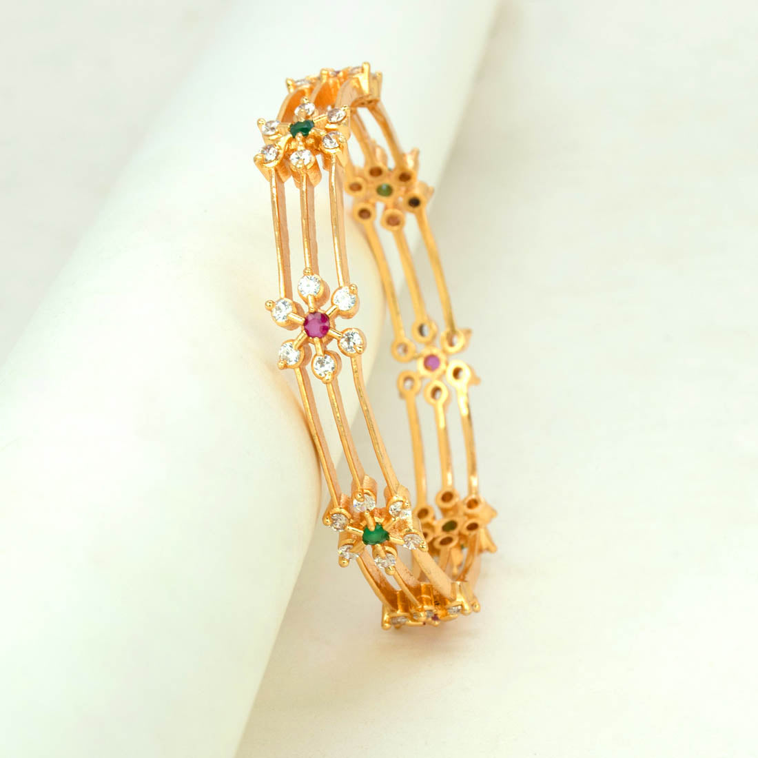 Trendy Gold Plated Floral Stones Thin Layer Bangle for girls and women. This versatile, multi-occasion jewellery has flower design adorned with synthetic Ruby, Emerald and CZ stones. This latest trendy stone bangle can blend perfectly with any dress and can be worn on any festive occasion or on a regular basis.