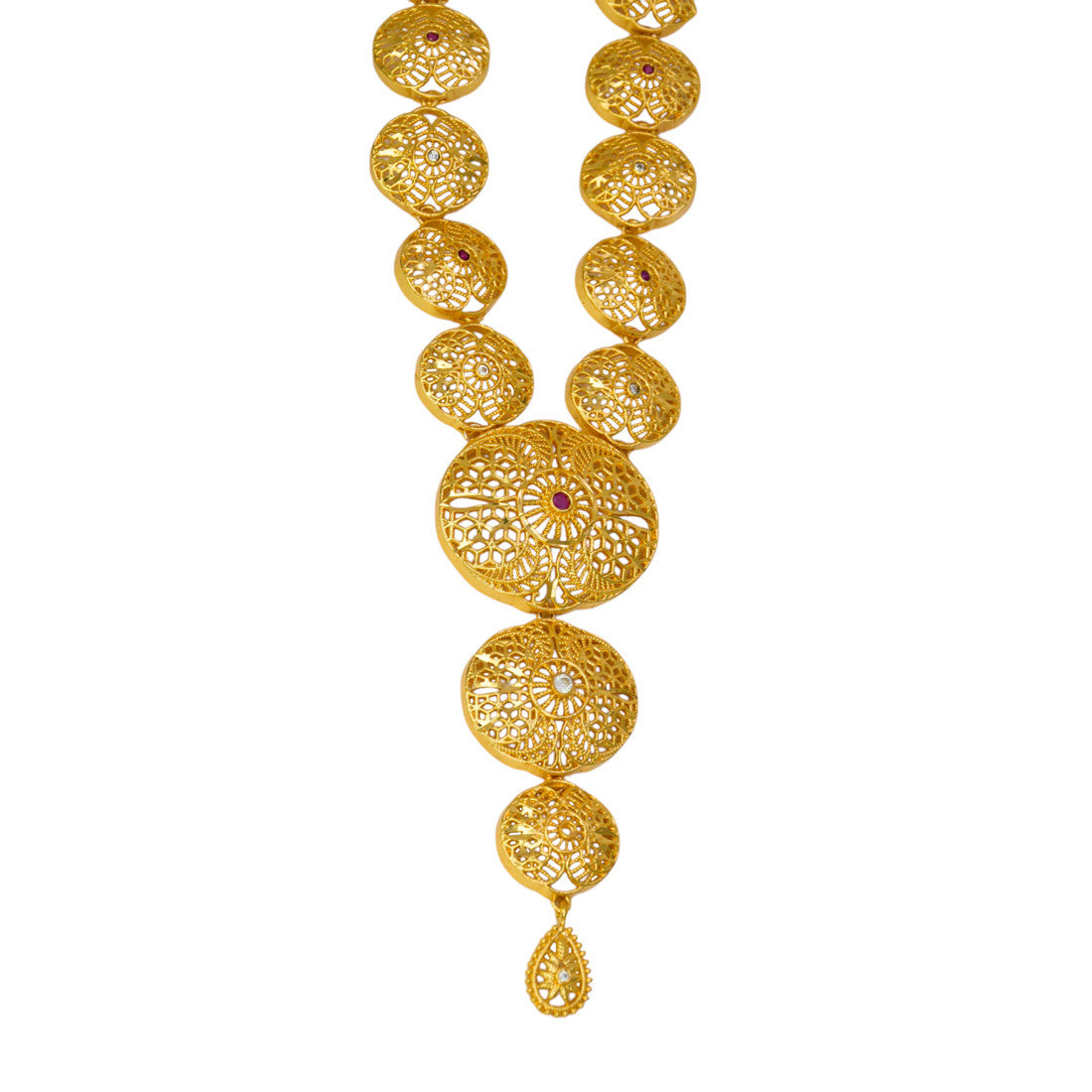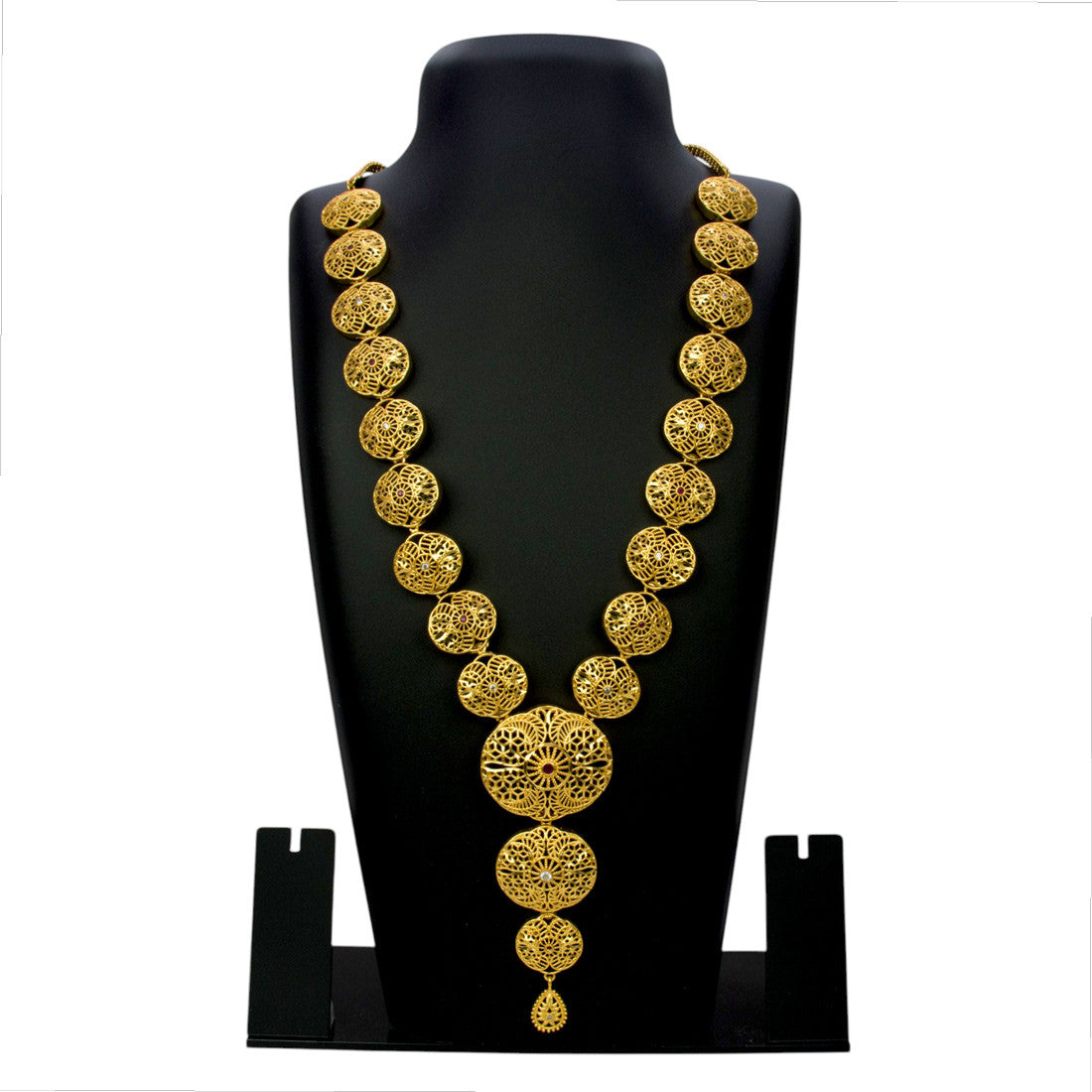 Trendy Gold Plated Mesh Designer Ruby Cz Bridal Long Chain combines modern flair with classic elegance, perfect for any bridal attire. Adorned with ruby-colored cubic zirconia, it radiates vibrant, regal beauty. The gold plating gives a luxurious, pure gold appearance without the high cost. Lightweight and comfortable, it can be worn all day with ease.