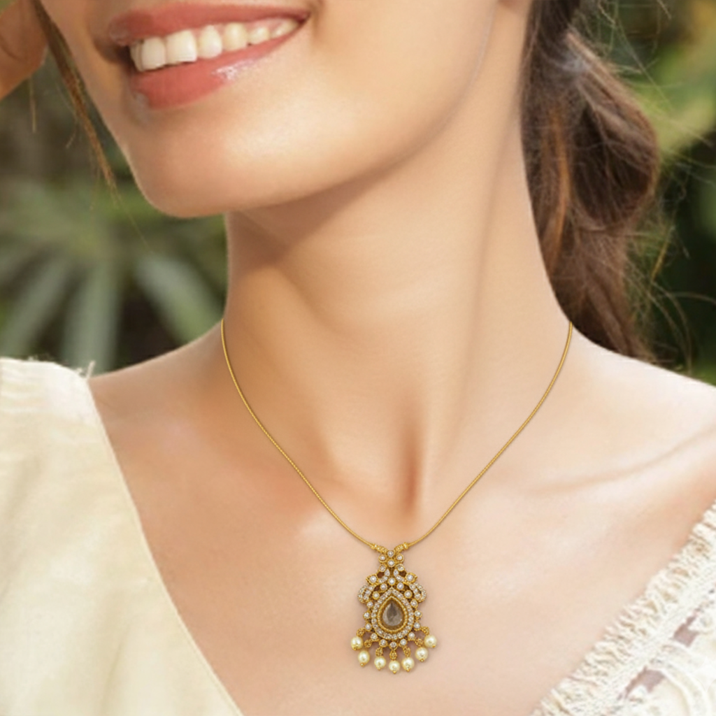 Trendy Invisible Chain CZ Victorian Pendant Necklace with a sleek invisible chain and dazzling CZ stones. Available in Emerald, Ruby, and CZ variants for a timeless and luxurious look. Ideal for parties and special occasions.